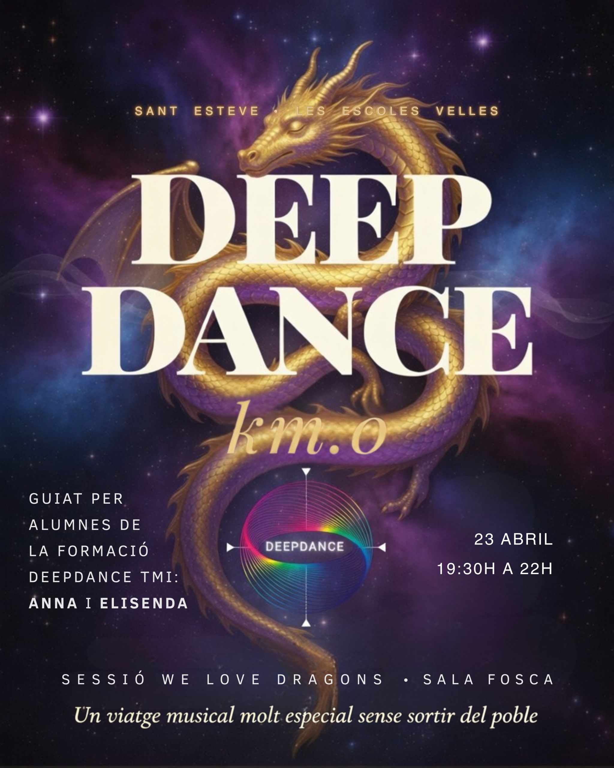 Aquesta sessió especial serà facilitada per Anna i Elisenda, alumnes de la formació de Deepdance, supervisades per Carol Villalón. Et convidem a submergir-te en una onada musical profunda i transformadora. Un espai on el cos es deixa portar i la ment es dissol, per viure una experiencia des de l ànima. En aquesta dansa no hi ha herois ni cavallers que salvin a desvalides princeses. No necessitem que ningú ens salvi, ni molt menys que mati el nostre instint. Les dragones ens volem vives. Les roses al seu test i els llibres per tothom! Aquí celebrem el foc i la força que ens habita. Encarnant el dret a sentir, a vibrar, a moure’ns lliurement. Som salvatges. Som lliures. Som cos en moviment.